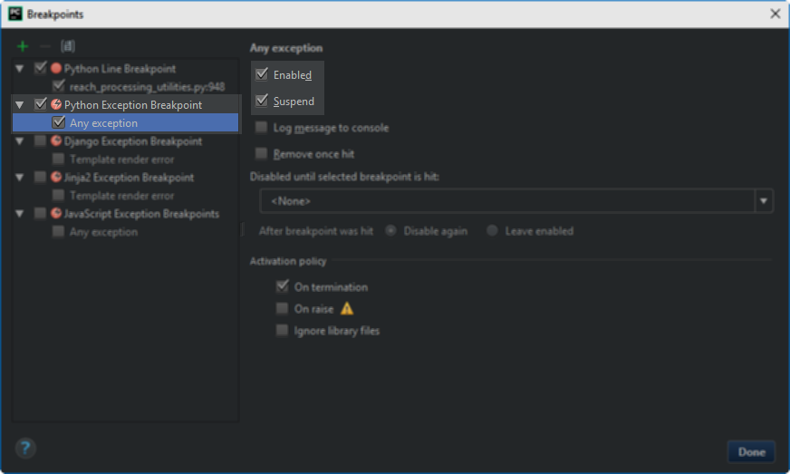 To ensure this is set up correctly, go to Run > View Breakpoints (Ctrl + Shift + F8). In the dialog box, ensure Python Exception Breakpoint is checked and under this, Any Exception is checked as well. With Any Exception selected, ensure Enabled and Suspend are checked as well. Click Done, and you will be good to go!